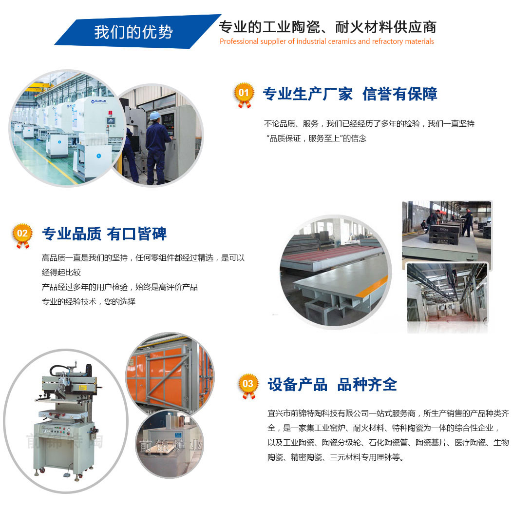 宜興市前錦特陶有限公司作為成員企業(yè)之一,公司主要生產(chǎn)工業(yè)陶瓷、窯具、匣缽、窯爐內(nèi)襯系列。工業(yè)陶瓷以生產(chǎn)氧化鋯陶瓷、氧化鋁陶瓷、碳化硅陶瓷、氮化硅陶瓷等先進陶瓷為主;碳化硅制品有碳化硅異形件、三明治板、爐管等系列;耐火高溫窯具為剛玉爐管、剛玉莫來石制品、剛玉推板等產(chǎn)品;以及燒結(jié)墊板、氧化鋁空心球制品、sic板、石墨坩堝、堇青石復(fù)合莫來石板移進板、鋯粉、氮化硅陶瓷環(huán)、陶瓷棒、石化陶瓷管、陶瓷基片、磨介、分級輪和氮化硅球閥、熱電偶保護管、升液管等... ![]() |